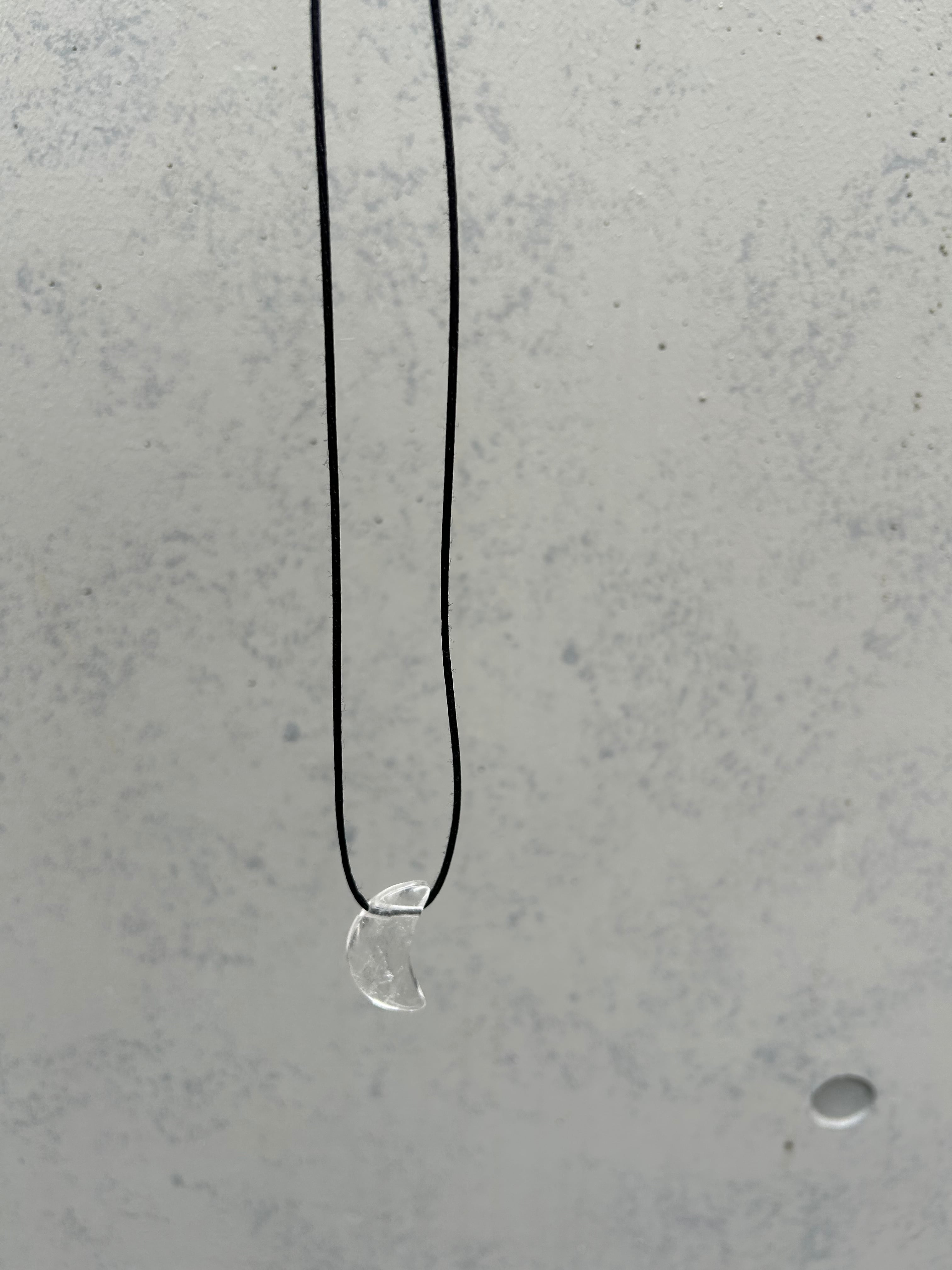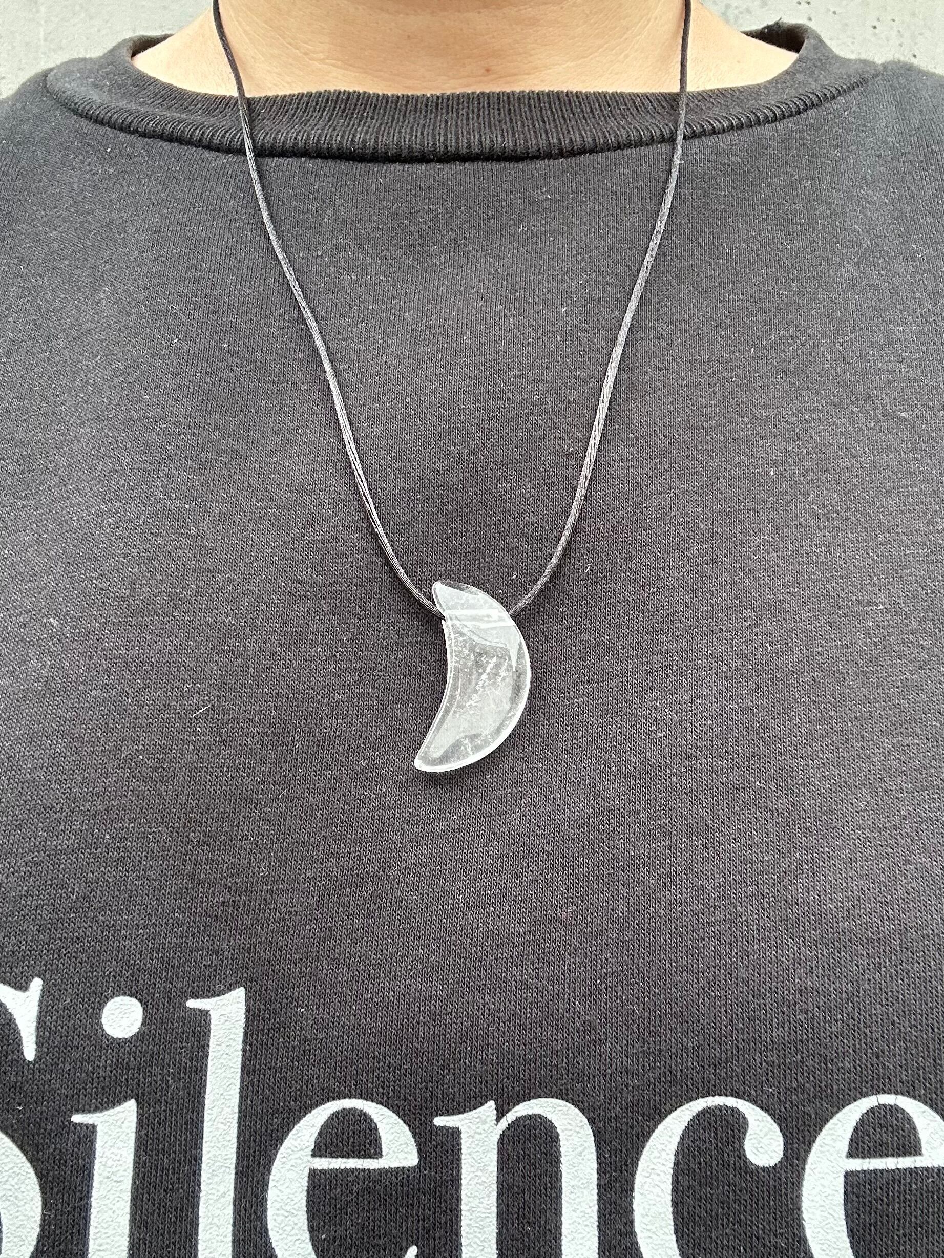 大きめな三日月型クォーツ(水晶)に直接シルクリボンを通したネックレスです。