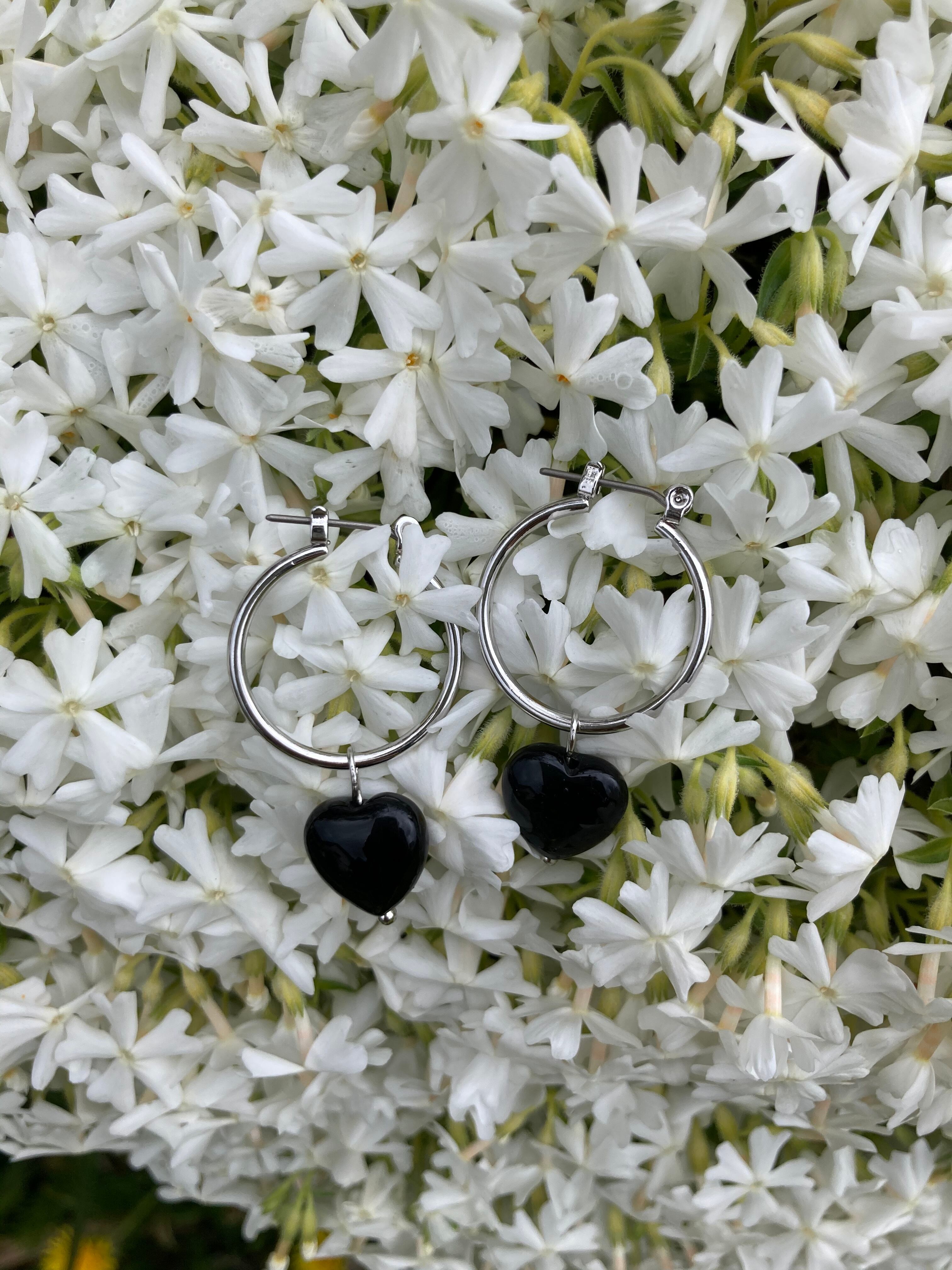 ハート型オニキスをシルバーカラーの太フープに合わせました。