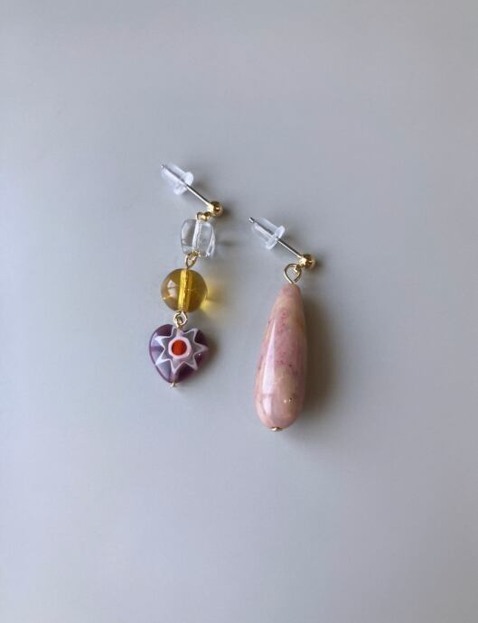 ロードナイトとミルフィオリビーズ、ヴェネチアンビーズ、チェコビーズを組み合わせたアシンメトリーピアスです。