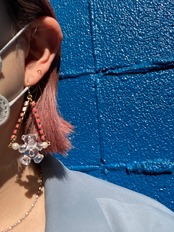 アクリルのクマと樹脂パール、チェーンを組み合わせたピアスです。