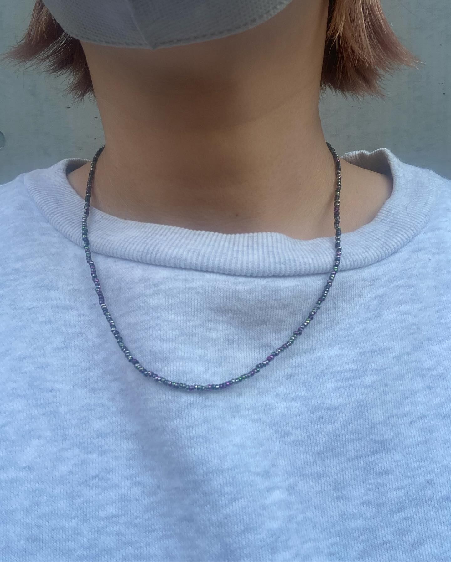 ビーズのひとつひとつがグリーンやパープルやクリアブラックなど、色々な表情を見せるビーズのネックレス。