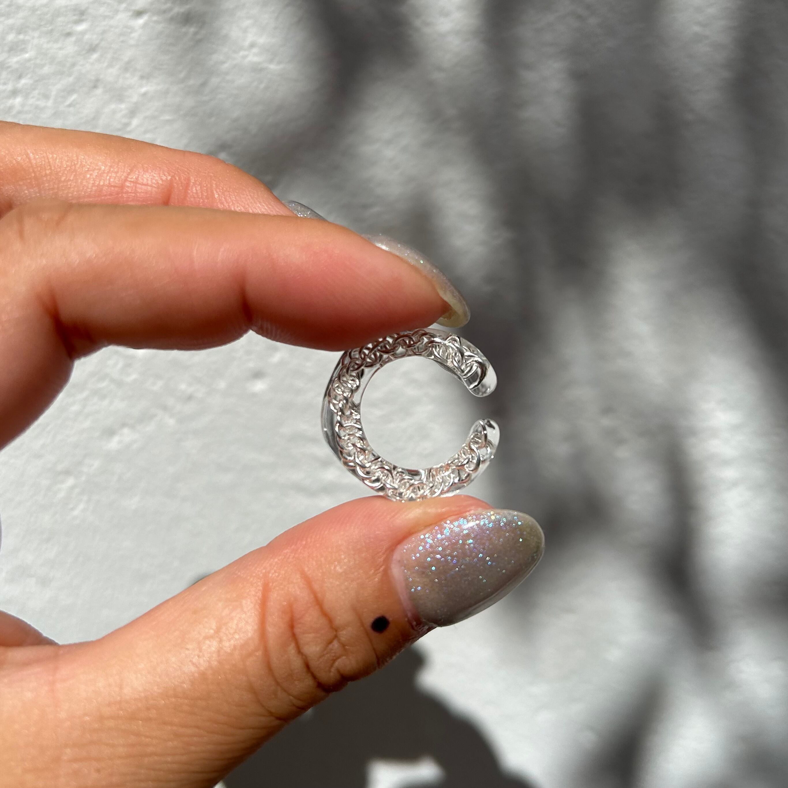 Oyire_の第2のシグネチャーアイテムの変形ボールチェーンを埋め込んだクリアイヤカフです。